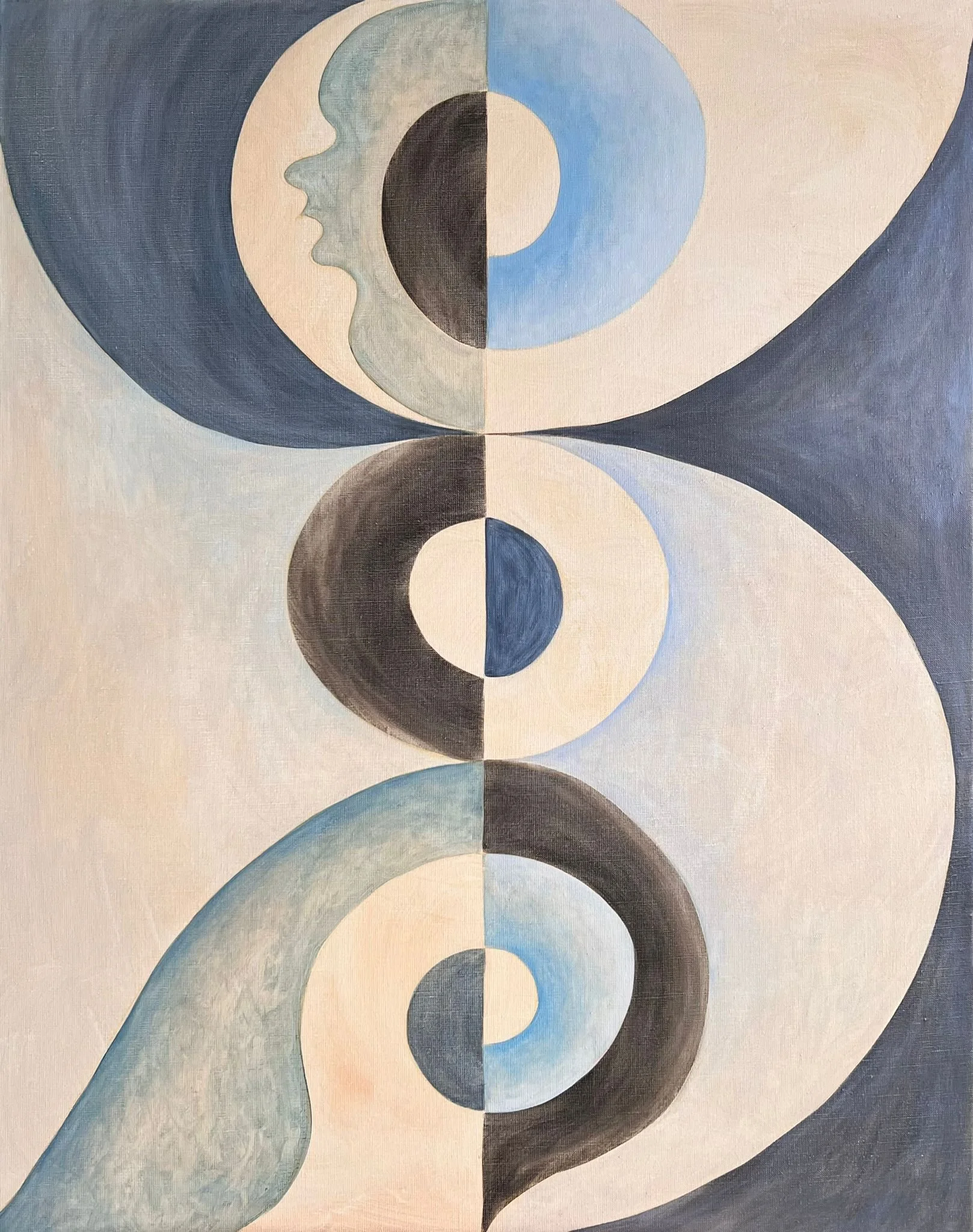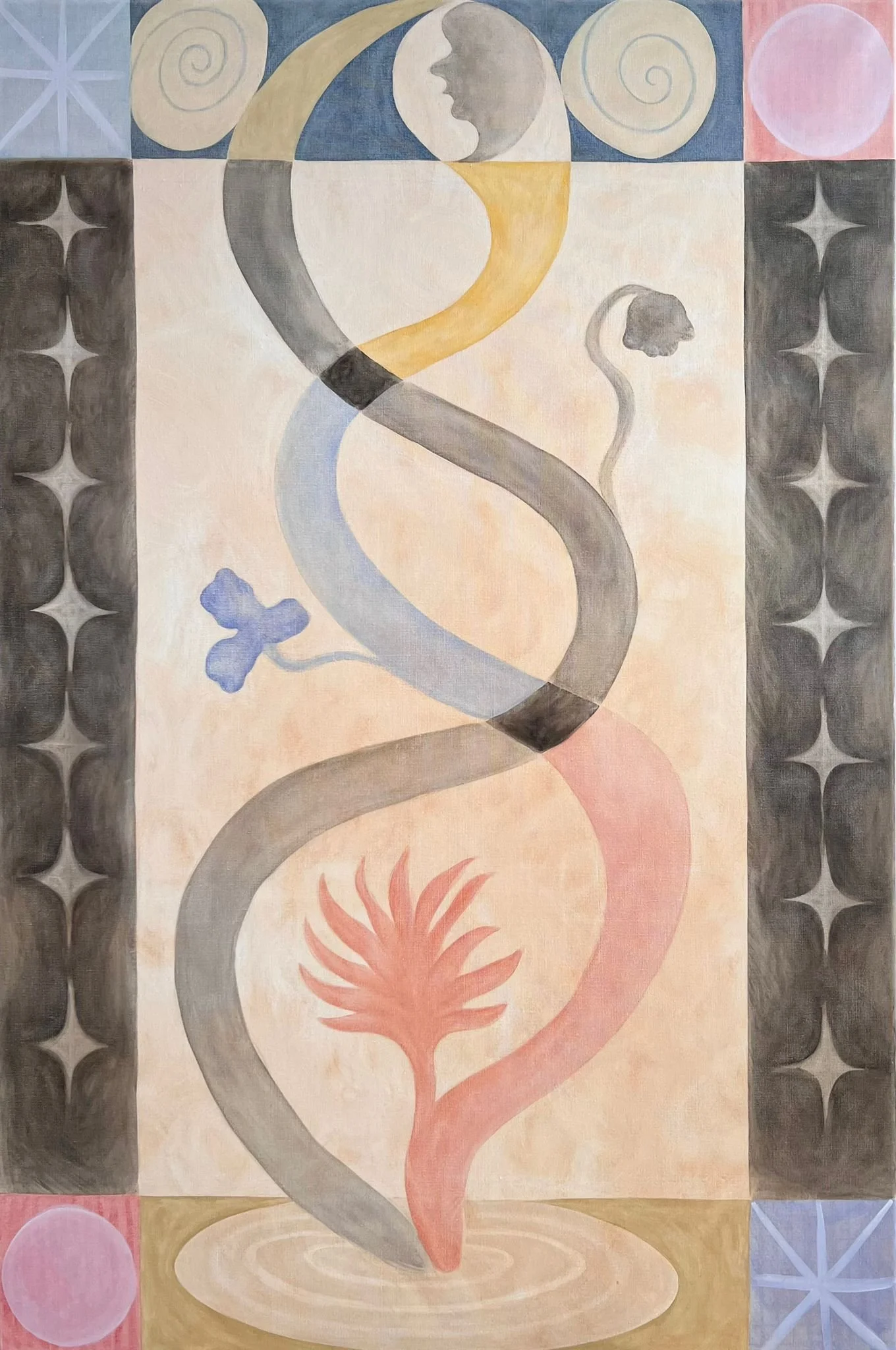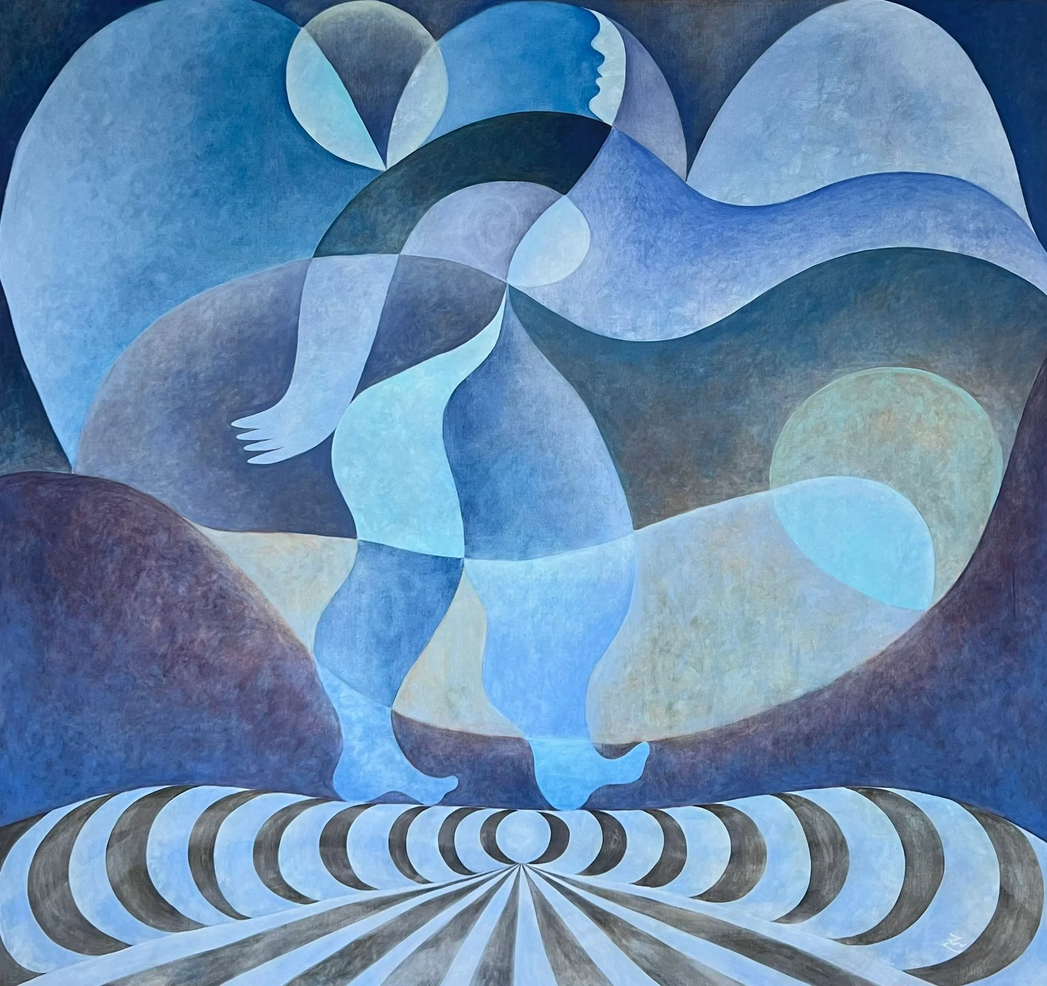 In her recent works, she turns toward more intimate, symbolically charged compositions, where movement and color convey both physical motion and the interior landscape of thought and sensation.